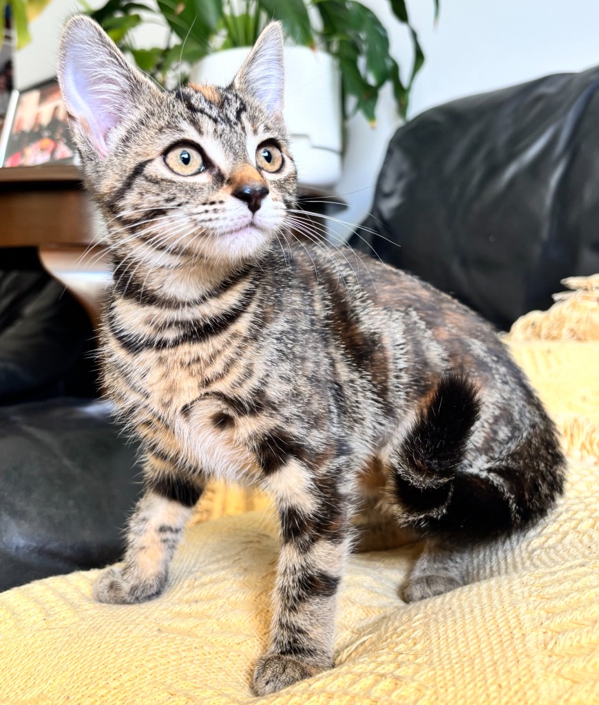 Lexie is a stunning torbie (brown tabby with ginger patches), she has the sweetest ginger patch on her forehead that is spectacular. She is an affectionate girl with a big purr, and a huge appetite for exploring. She is fearless, and can get herself into trouble from that, so you'll need to be on your toes with this bright and active little cat!