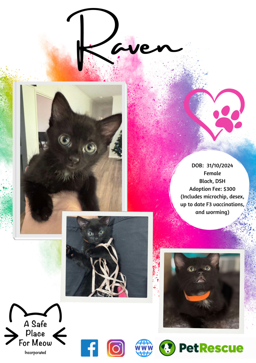 Raven was rescued with her 2 sisters Onyx and Storm and beautiful mum Ebony, and we’re so excited for them to meet their new families! She is a little quieter than her sisters Storm and Onyx. This beautiful kitty loves a play and a cuddle