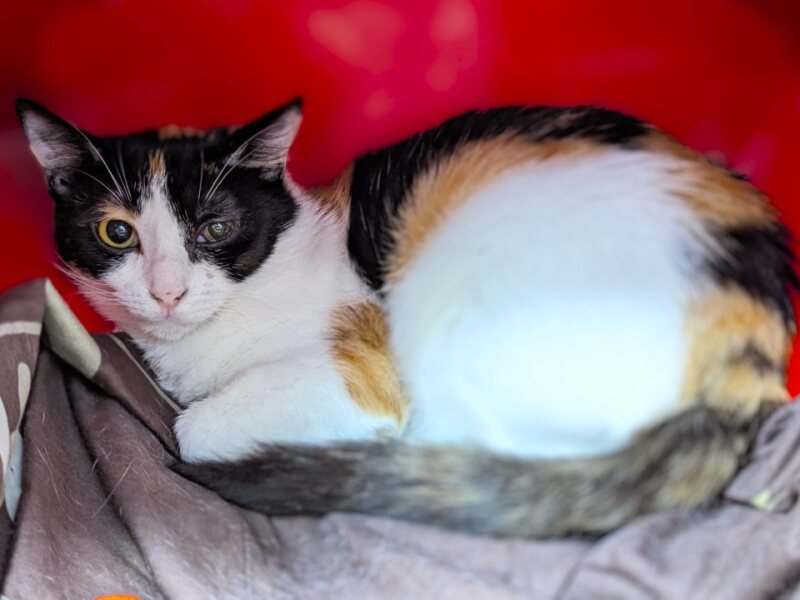 I am a shy and polite young lady looking for a loving forever home. I am a gentle soul who prefers the safety and security indoor life has to offer. I have been through some tough times, found tapped up in a box with 3 other cats. I was so scared and thought it may have been the end, but then the box opened and some caring humans gave us treatments and yummy foods and found us a foster home where we can recover and build trust again. This is probably why I am shy and timid when first meeting people, but once I warm and become familiar with my environment and loved ones, then you will see the more relaxed side of me. I love playing with string toys and sleeping next to my human. I also love sitting by the window and feeling the sun and breeze, and enjoy watching the birds and outside life. I startle with loud and unfamiliar noises but I know I am safe inside, away from the dangers of street life. I enjoy my food so if you offer me yummy stuff like chicken and tuna in spring water, then you can have my heart. If you have space in your heart and home for me and would like to arrange a meet and greet, please ask for me at front counter.