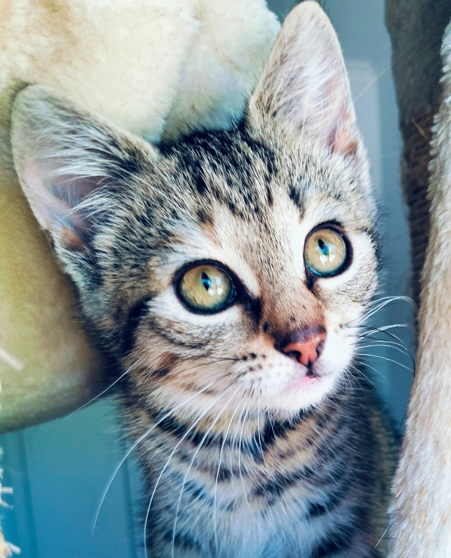 Meet Pumpkin, an adorable tabby kitten who is loving and affectionate. Pumpkin is a curious little explorer who loves to chase toys, pounce, and play to her heart’s content. She is a tiny, busy little girl. When she's not playing, Pumpkin loves a cuddle and a pat, and she purrs loudly. She would make a great companion for both families and individuals looking for a fun and loving kitten to brighten their home. A home with lots of toys, scratching posts, and cosy napping spots would be perfect for this little adventurer.