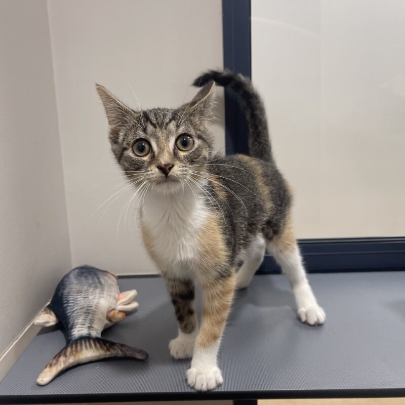 Hello there, my name is Molly! I am a 2-month-old Domestic Short Hair kitten with a heart full of love and paws full of play. Being a girl with high energy levels, I am always ready for an adventure. I love to scamper around, explore new corners, and turn ordinary objects into exciting toys. My curiosity is as big as my charming personality! I haven't met any children yet, but I am a friendly kitten who loves to meet new people and make friends. I'm confident that I would get along well with everyone in your family. After a long day of play, I like to curl up for some cuddles. I might be small now, but my love for you will be huge. If you are looking for a fun-loving, playful, and affectionate companion, then look no further. I can't wait to be the newest addition to your family and bring joy to our lives. Come meet me, and let's start our forever together!