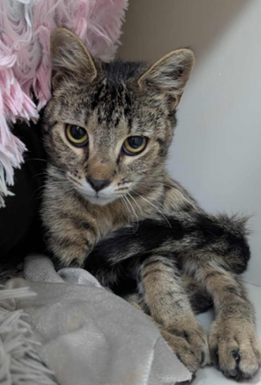 This sweet boy is a pretty shy at first, but don’t let that fool you. Once he’s settled in he’s an incredibly affectionate, cuddle-monster who even loves full belly rubs! He is also super playful and loves his toys, he will bound around and play just like a big kitten 🙂
