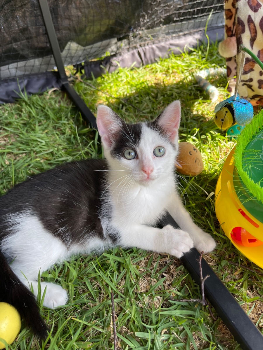 I am approximately 11 weeks old and came into care with my sister Hattie after we were found in a roof at a tiny 2 weeks old. Little Beans had a mumma with 6 babies who took us on and raised us as her own, her name is Valerie and we love her so much.