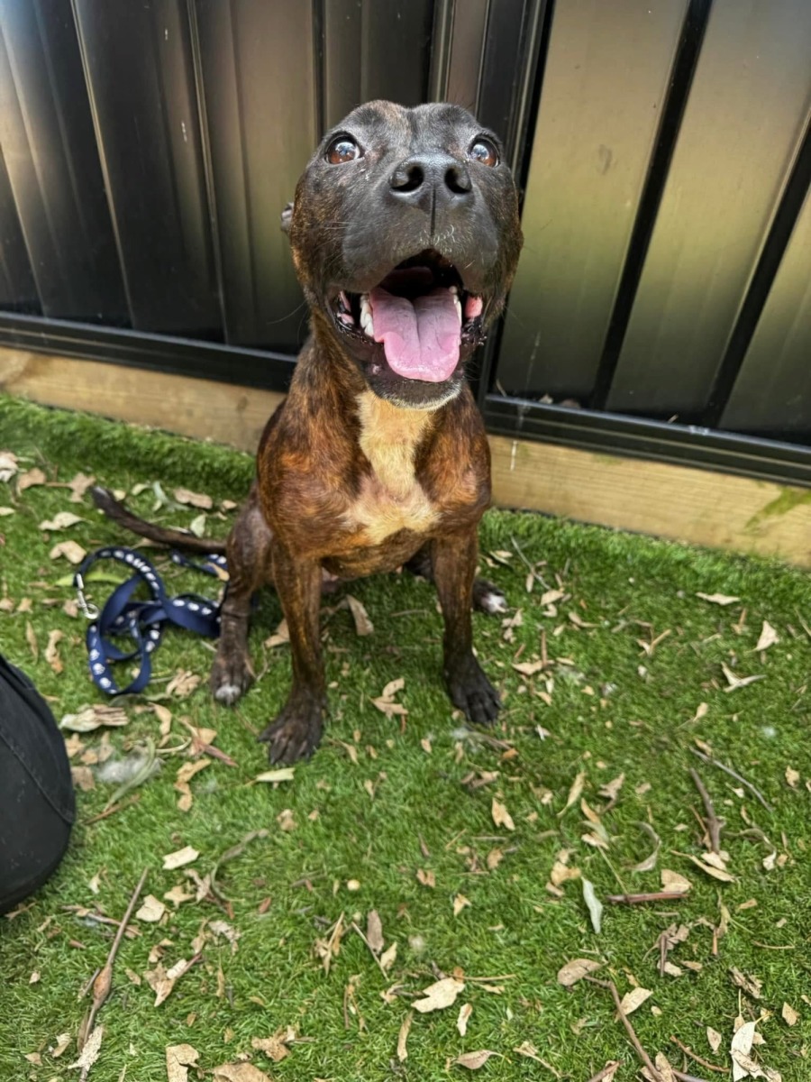 Mabel is an active little lady who thrives on interaction with humans. Her friendly nature means she delights in being the center of attention and loves to spend time playing, walking, or simply being by your side. As an English Staffy, she combines boundless affection with an energetic vibe, always ready to create new moments of fun with her human companions.