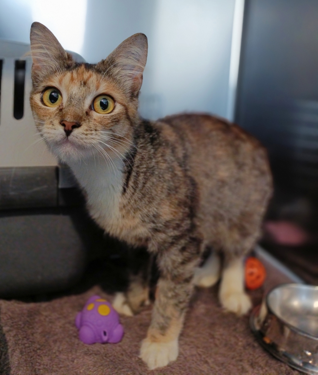 Meet Sarah, an energetic young cat with a pretty tabby, torti, and white coat. Despite coming from a neglectful background, Sarah is quickly gaining trust and showing her bubbly personality. She loves food and is always ready to play with other cats. Her litter box training is going well, and her bright eyes show her curiosity and love for exploring new spaces.