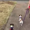 We are unaware of how much socialisation Dot and Dash have previously had with other dogs. When out walking, Dash is extremely neutral to any other dogs and is happy to walk on by. Dot shows more interest and pulls a bit towards the other dog and is unsettled – no barking or aggression; however, she will settle with guidance relatively easily. They have been on pack walks alongside other dogs so would be fine to go on walks with your friends’ dogs once they have settled in if you like.