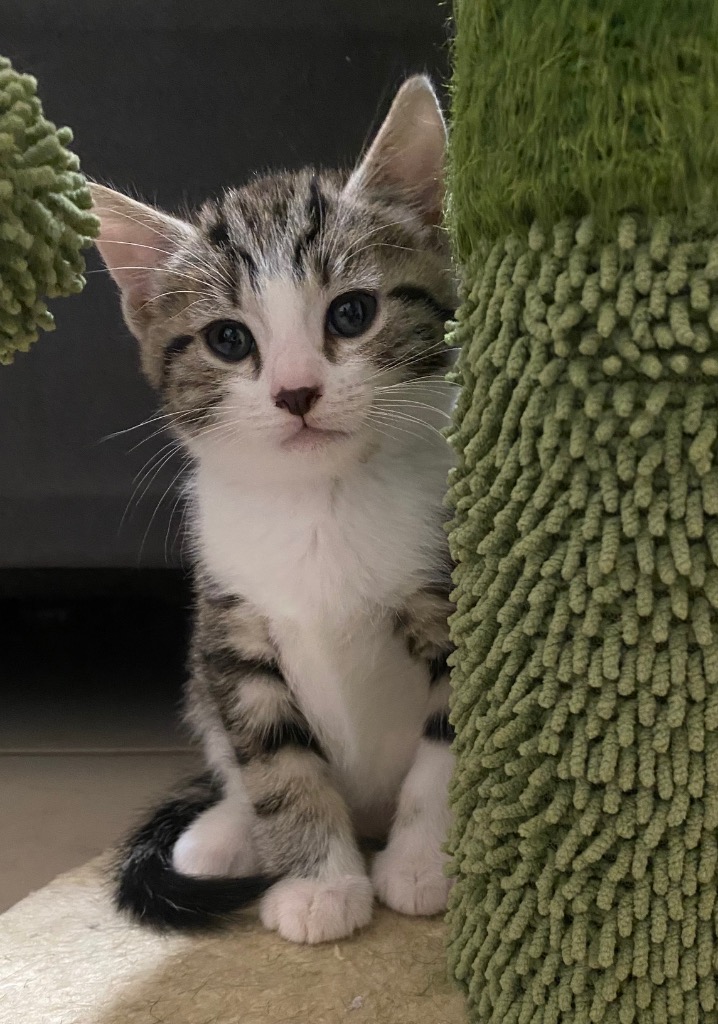 Sweet little tabby and white boy. Keeping with our Christmas themed names, Taraji - meaning "Hope & Faith" was born to a very young mumma who at the time she was pregnant, was dumped from a car. Mumma Cady, found a quiet place in a maintenance shed to give birth to her 4 babies. They were found and handed over to SAFE. Mumma and babies have been safe inside a room of their own - and the babies are just beginning to leap and bound and wrestle with one another. The girls of the litter are far more outgoing than the brothers - but once the babies are weaned from mumma and moved to a new foster home - they will flourish with all the attention. Nice fat, fluffy potatoes - kittens will be ready for adoption at 8 weeks of age.