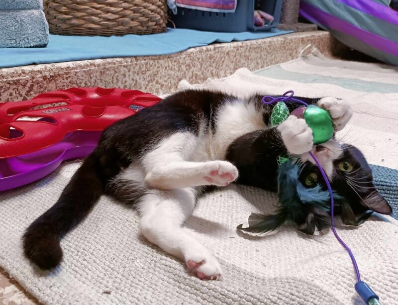 Hey, there! I'm Gizmo, a young male Domestic Short Hair cat. Just like the cute creature from the movie Gremlins, I'm a playful ball of energy with a charming personality, minus the havoc, of course! I'm pretty proud of my sleek, shiny coat - it's super low maintenance, perfect for those who aren't fans of constant grooming. But don't let my low-maintenance look fool you, I'm all about the love and attention. I enjoy being around people and I'm great at making humans smile with my adorable antics. I'm still young, so I have lots of kitten energy. Playtime is my favorite - especially with those feathery toys. But don't worry, I also love nap time and there's nothing I enjoy more than curling up next to a warm human. I'm eager to find a forever home where I can grow, play, and, most importantly, be a part of a loving family. I promise to bring lots of joy, laughter, and love into your life. Can't wait to meet you!