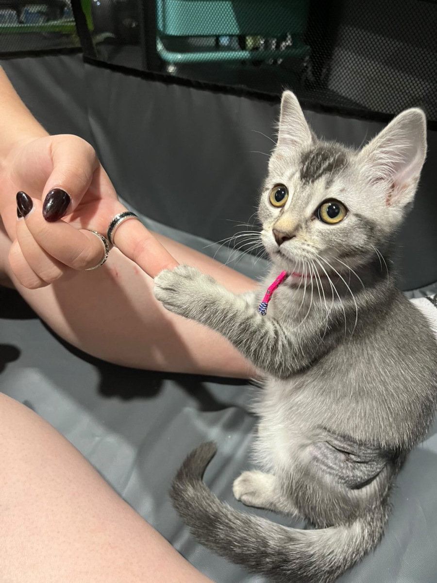 Meet Dubu, the adorable silver tabby kitten with a penchant for wearing hats and a heart full of love! Her strikingly beautiful coat and playful personality are the first things that captivate those who meet her. She’s a charming little feline who's always ready to make friends and share his affection.