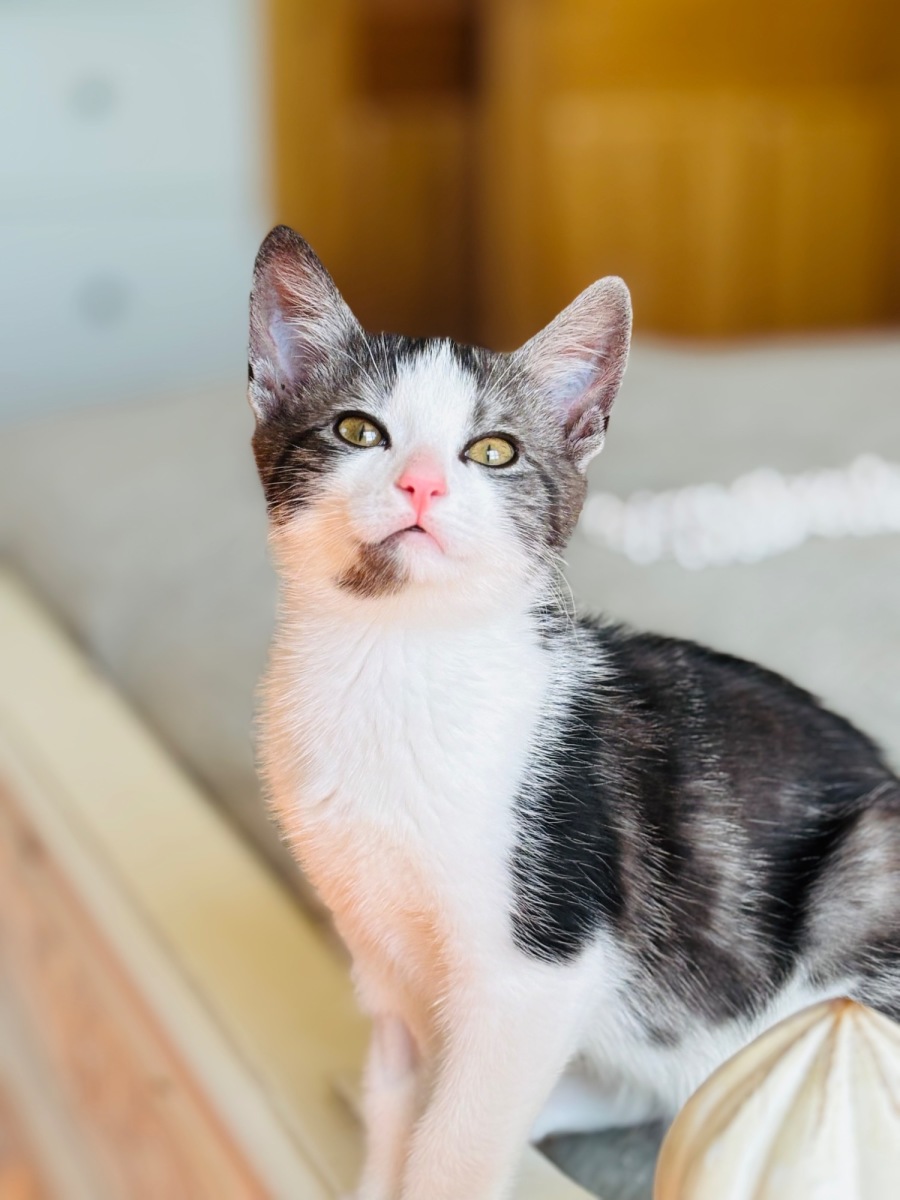 Meet Ace, a gentle 14-16-week-old sweetheart who's ready to bring joy and cuddles to your home! This adorable grey and white kitten is the perfect combination of playful and relaxed.