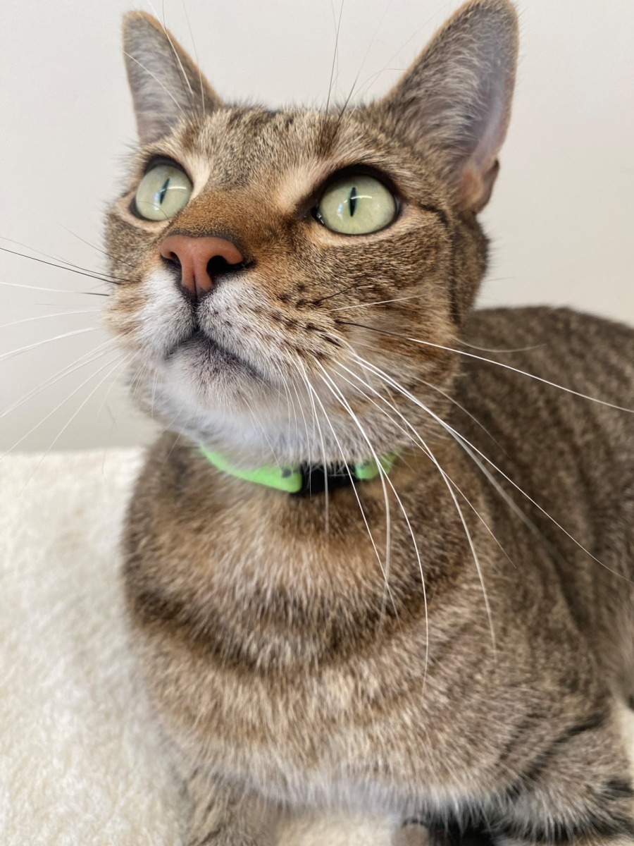 Meet Scout, a gorgeous tabby with striking green eyes that mirror his adventurous spirit. This charming feline is not just a beauty but embodies the perfect mix of friendly affection and independent charisma. Scout loves spending time with you and is always up for a gentle head or chin scratch.