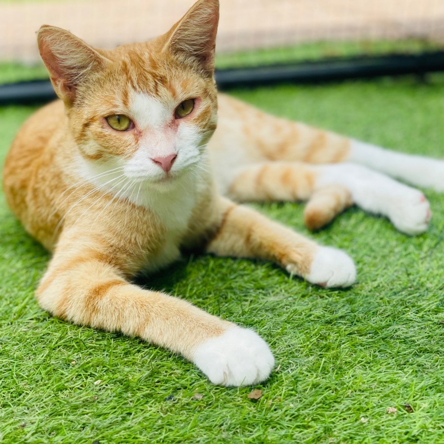 She is a has a beautiful ginger coat with patches of white on her face and chest. Amy is also mitted which is a cute feature looking as if she is wearing little mittens on her feet.