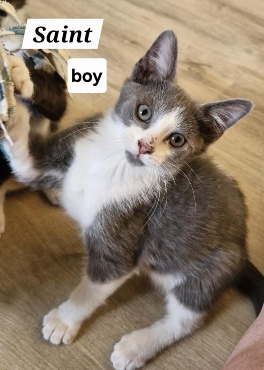 Saint is a playful little man with a sweet temperament. He loves his toys and his siblings but also spends his time playing with other foster siblings but humans are his favourite. Zoomies up and down the hall are so much fun especially when someone else joins in. He is such a snuggle bug in the evenings when he is a tired little man. He will purr as soon as you pick him up and makes bickies on your knee. Kisses and head butts are a must. He loves the dog but can get up close and personal which is sometimes a little too much for the dog. Saint loves sitting on the window sill in the sun during the day and is looking for a special someone to play with and love him. He follows his foster carer around like a little lamb and has to be with his human when they are home. Saint was born with pectus excavatum which is a deformity of the ribcage. He had surgery when he was just a baby and is expected to have a long and fulfilling life with the perfect family. He will need to lead a non-stressful life so young children are a no no. A quieter home with someone to lavish him with love is all wants. Saint is desexed, vaccinated, microchipped, wormed, flea treated and vet checked. He is currently housed in Goulburn.
