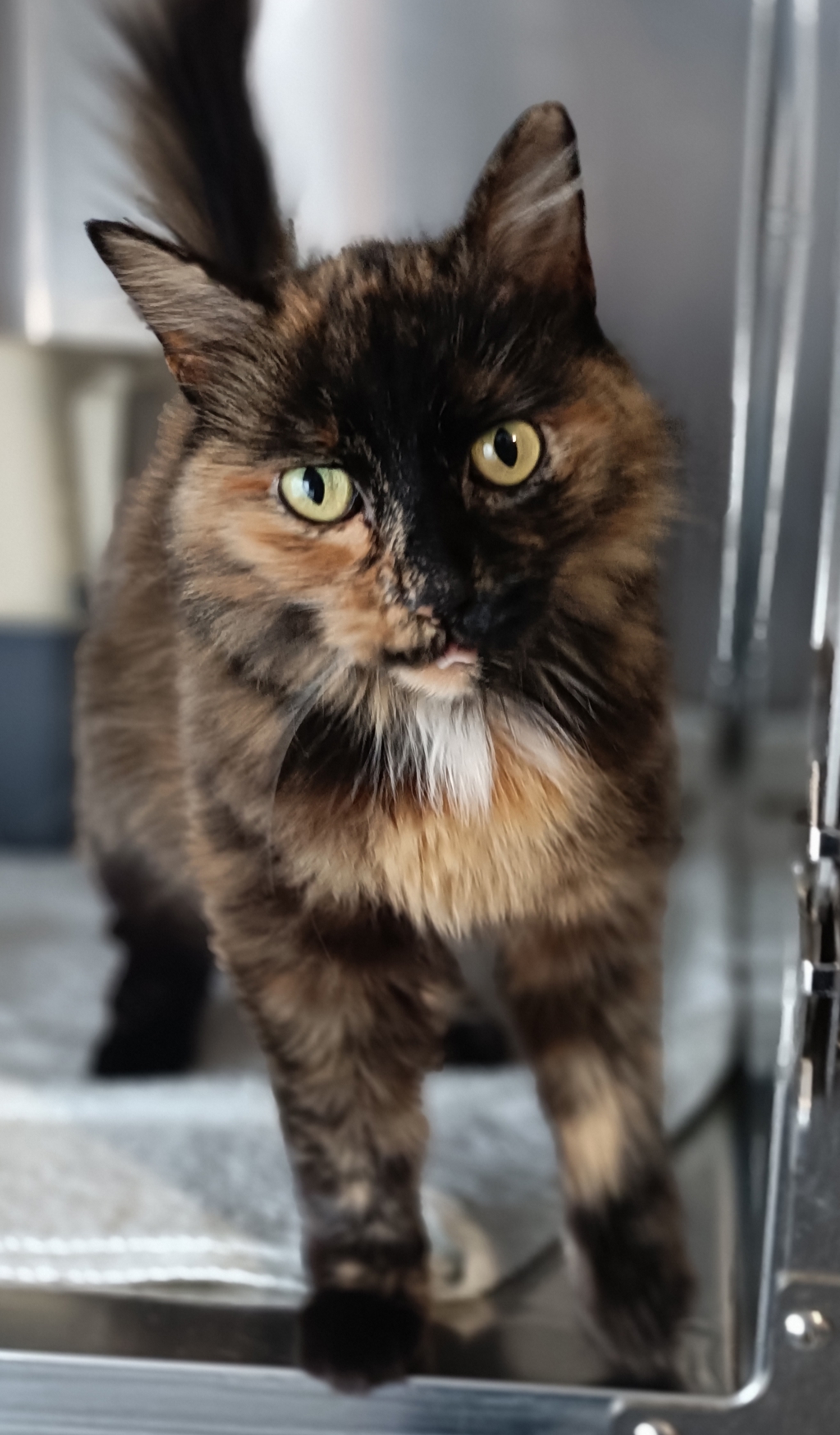 Tigre is a beautiful female fluffy tortoiseshell cat who is looking for her forever home. She is a lovely and smoochy girl who adores people and loves nothing more than cuddling up on the couch with her human companions. Tigre hasn't lived with other cats before, but she doesn't seem to be annoyed by them and could potentially adjust to sharing a home with another feline friend.
