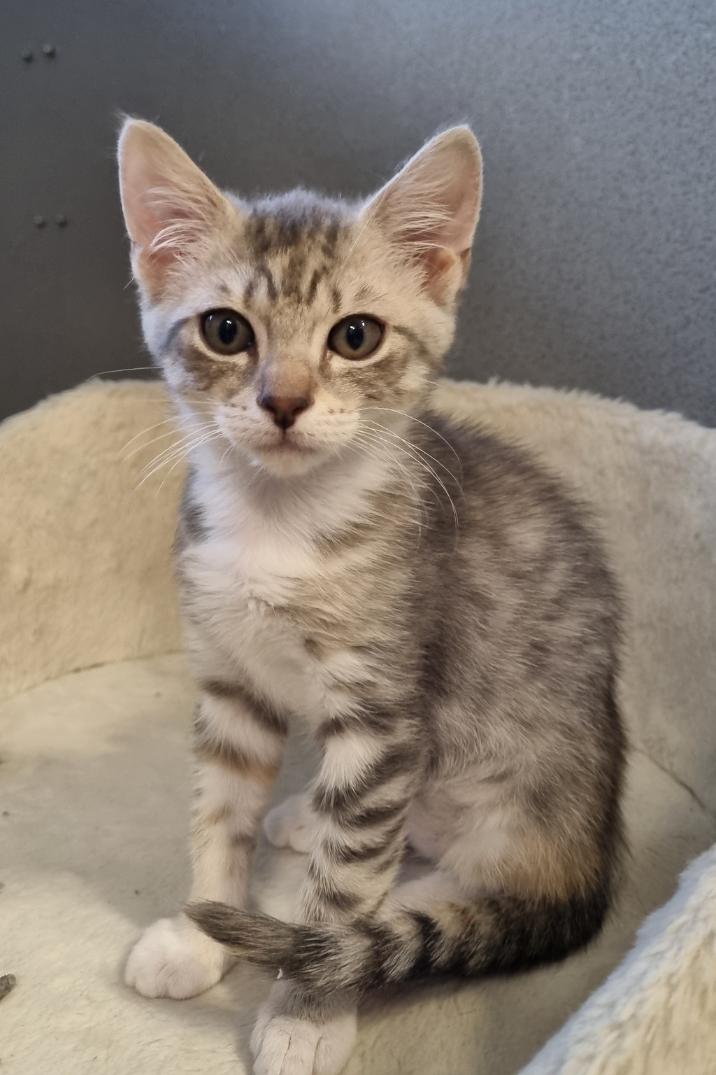 Hello, I'm Cher! I'm just a kitten, but I've got the heart of a lion. I'm sweet and friendly, always ready to nuzzle against a kind hand. I'm playful and goofy too, always chasing after imaginary mice and making my shelter friends laugh. Energy? I've got loads of it! I'm like a tiny ball of sunshine, always on the move. I'm also very curious, always eager to explore new corners and crevices. But what I really want is a forever home, a place where my playful antics and sweet nature can bring joy every day. Adopt me and let's fill our days with fun, laughter, and lots of love!