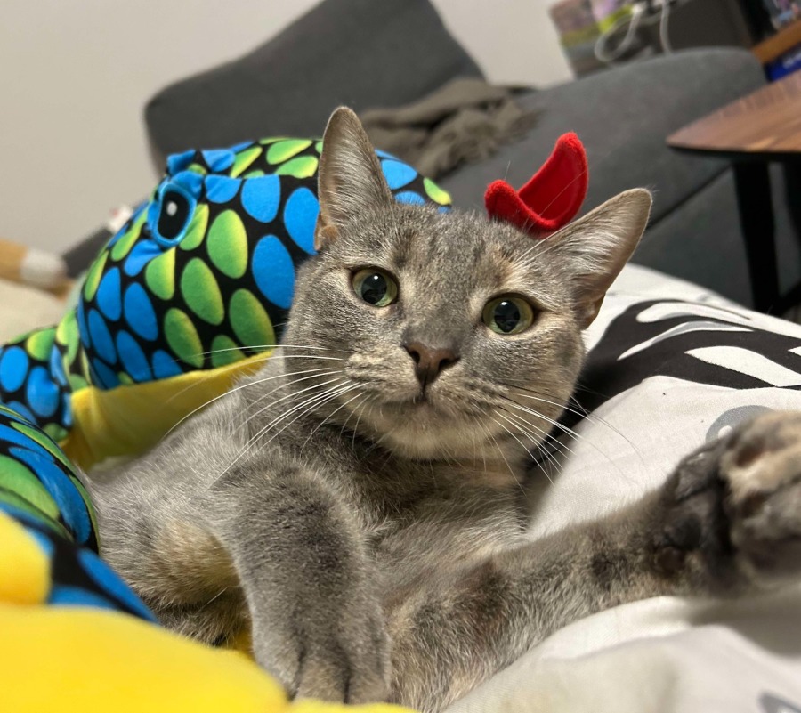 She is such a pretty cat who has beautiful markings, soft grey fur, a big heart and such a playing / very loving persona. It won’t take her long to warm up to you or a new home.