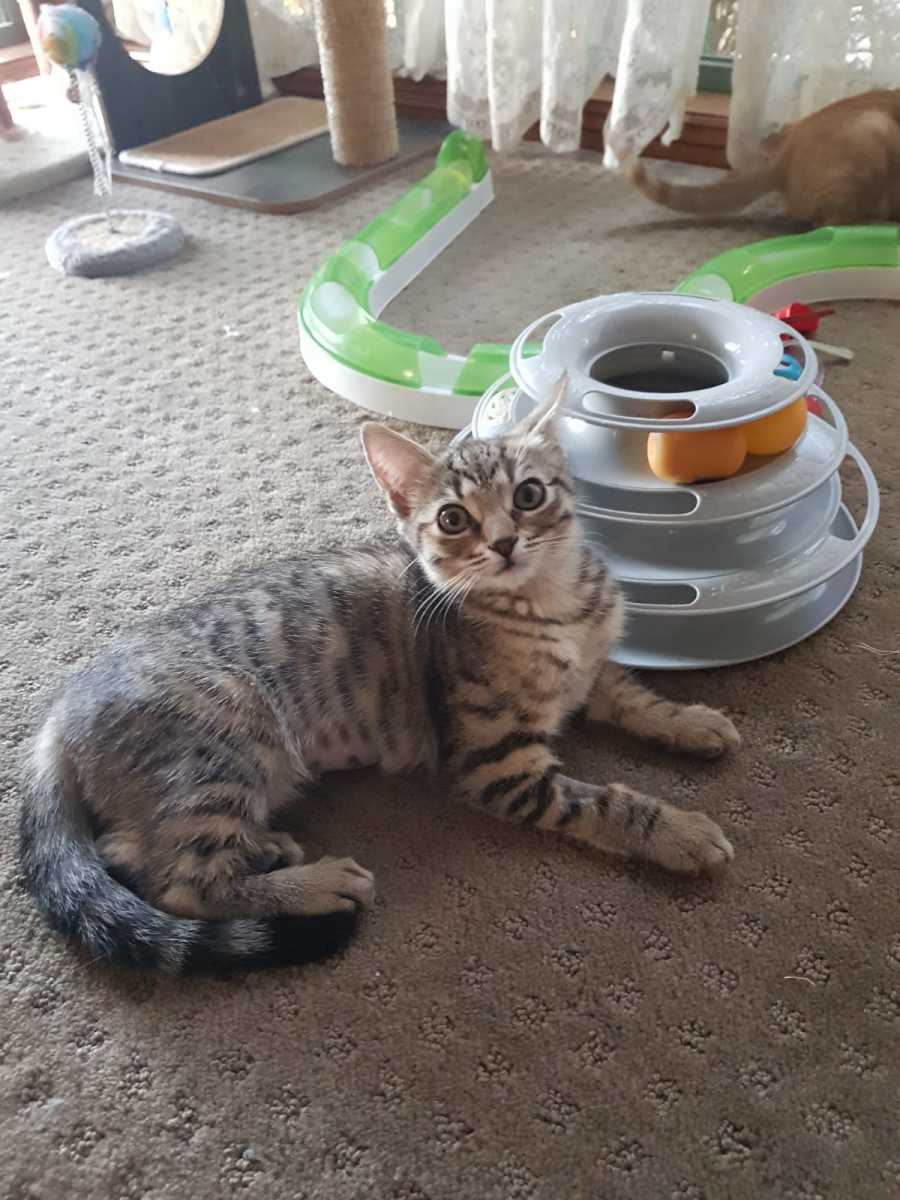 She has an adventurous spirit, often found perched by a window, mesmerized by the happenings outside. Birds are her favorite, and she will spend endless hours watching them in the bushes. Inside, she's a bundle of energy, happily chasing after her toys and playfully attacking ribbons tied to a chair. Astred even has a cute habit of carrying her favorite toy around the house, showcasing her adorable puppy-like behavior.