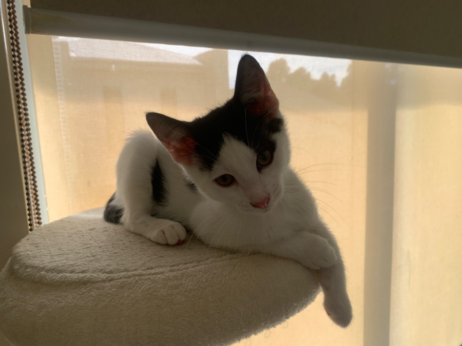 This sleek and smooth kitten is all about fun and adventure. With his unique black-and-white coat pattern and a charming white tip at the end of his tail, Nick is as handsome as they come!