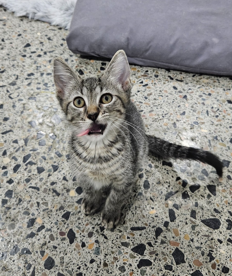 Meet Nami, a gorgeous brown tabby kitten with the most adorable quirk: she chirps and chatters with excitement when she sees anything flying, especially her toy wands! It's seriously the cutest thing! This playful girl also loves cuddles and chin scratches.