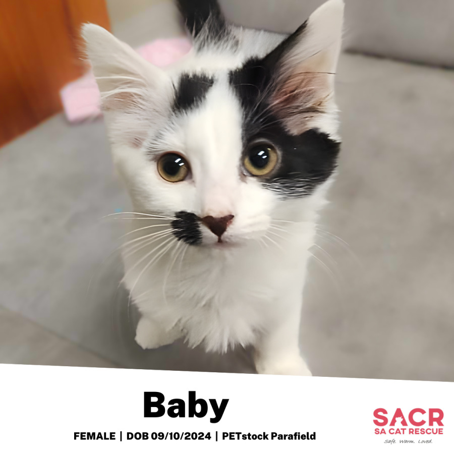Baby's adoption fee is $195 which includes desexing, microchipping, parasite prevention, and initial F3 vaccination.