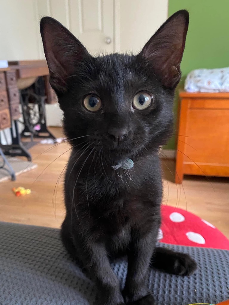 Spark is a stunning black, medium-haired kitten with a sleek coat that adds to her "mini panther" charm. Her striking appearance is only rivaled by her vibrant personality. Full of energy and curiosity, Spark loves to explore every corner of her environment, constantly chasing after toys, pouncing on tails, and engaging in playful wrestling matches with her siblings. Her zest for life makes her the heart of any playtime session, as she’s always the first to leap into action and the last to stop having fun.