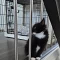 Cosmo is a curious and adventurous little tuxedo boy with the funniest face, with long, perfectly symmetrical white whiskers that give him a cheeky look - and cheeky he is! More photos and videos on Insta @two_white_foster_cats