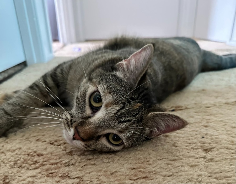 I settled in easily and take most things in stride. New people might get a brief moment of caution, but I warm up quickly and will soon come over for pats and play.
