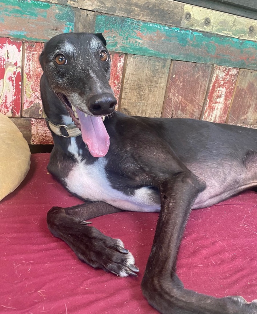 Choco is an absolute gentleman. Quite the velcro dog, he likes positioning himself against your side conveniently with your hand on his head! This smoochy boy is the perfect companion dog. He is a happy, responsive, and very loving. Choco would suit a home with an older person or couple, or home-body, with another Greyhound or canine companion. Everyone should have a little sweetness in their life!