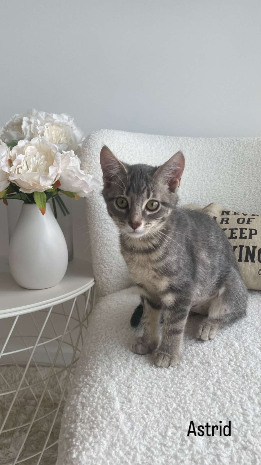 Astrid loves giving affection on her schedule, and then this kitten will shower you with love and she's sweet as can be. Often seen with her little arm draped protectively around siblings. She’s the perfect mix of playful and loving, a sharp and cheeky girl who will keep you smiling with her antics and melt your heart when she finally settles in for a snuggle. Astrid is a true character, as you can tell by her photos - a confident and clever little star.