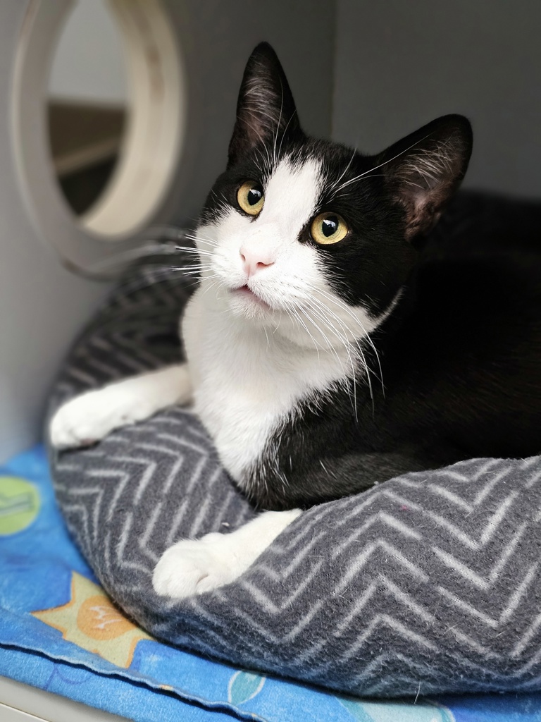 Looking for a feline friend who's the full package of charm, cuddles, and playfulness? Meet Tortilla! This dashing young black-and-white boy is ready to steal your heart with his sweet nature and adorable antics.
