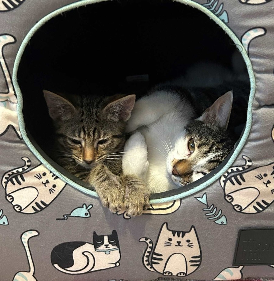 She’s settling into the foster home and now accepting pats, they’re sure she will be a big ol snuggler once she’s more comfy and settled in. She loves to lie around the house, explore and find hiding holes to claim before coming out to romp around the house. She also loves to snuggle and hug her sister, Raf!