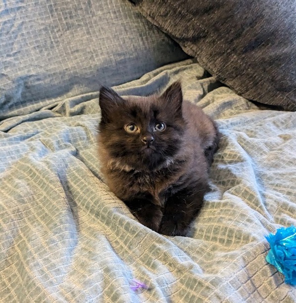 Peach is a lovable, playful kitten who adores being around people and sharing her affectionate nature. She's full of energy and charm, always ready to chase after toys or snuggle up for some quality cuddle time.