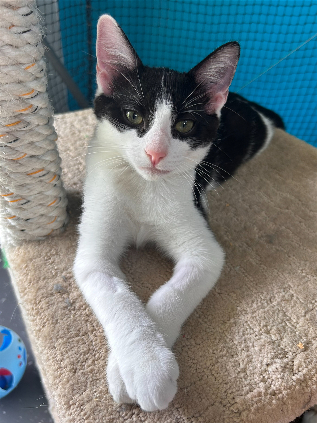 I'm sweet, friendly, and oh so cuddly! I just love to snuggle up with anyone who's willing. When I'm not napping, I'm a bundle of energy. I love playing with my fellow kittens - we have such fun together! I'm also a big fan of dogs, I love following them around for some attention and slobbery kisses! I'm a confident little guy too. I'm not afraid to explore and try new things. But at the end of the day, what I want most is a family to call my own. I'm loyal and I promise to bring so much joy to your life. So, why not take a chance on me? Adopt James, the sweet, friendly kitten who loves to play and cuddle.