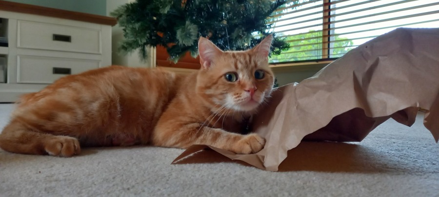 In between sessions of eating and sleeping George likes to explore and play. He likes being indoors and outdoors. He very much enjoys sleeping on his favourite box next to a window-sill during the day or on his favourite piece of carpet in the living room during the evening. He also spends time sleeping on a favourite corner of my desk at times during the day while I am working.