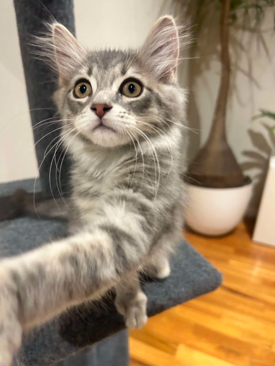 If you’re looking for the perfect mix of playful and affectionate, Miso is the kitten for you! Miso, also known as Mr. Static due to his crazy hair, loves to chase toys and explore his surroundings but also has a mellow, snuggly side that melts hearts. Miso is so attentive that he'll come running when you call him—he's even better at it than most dogs! He enjoys getting crazy, playing with his sibling Soba on their cat tower, but is the more chill and affectionate of the two.