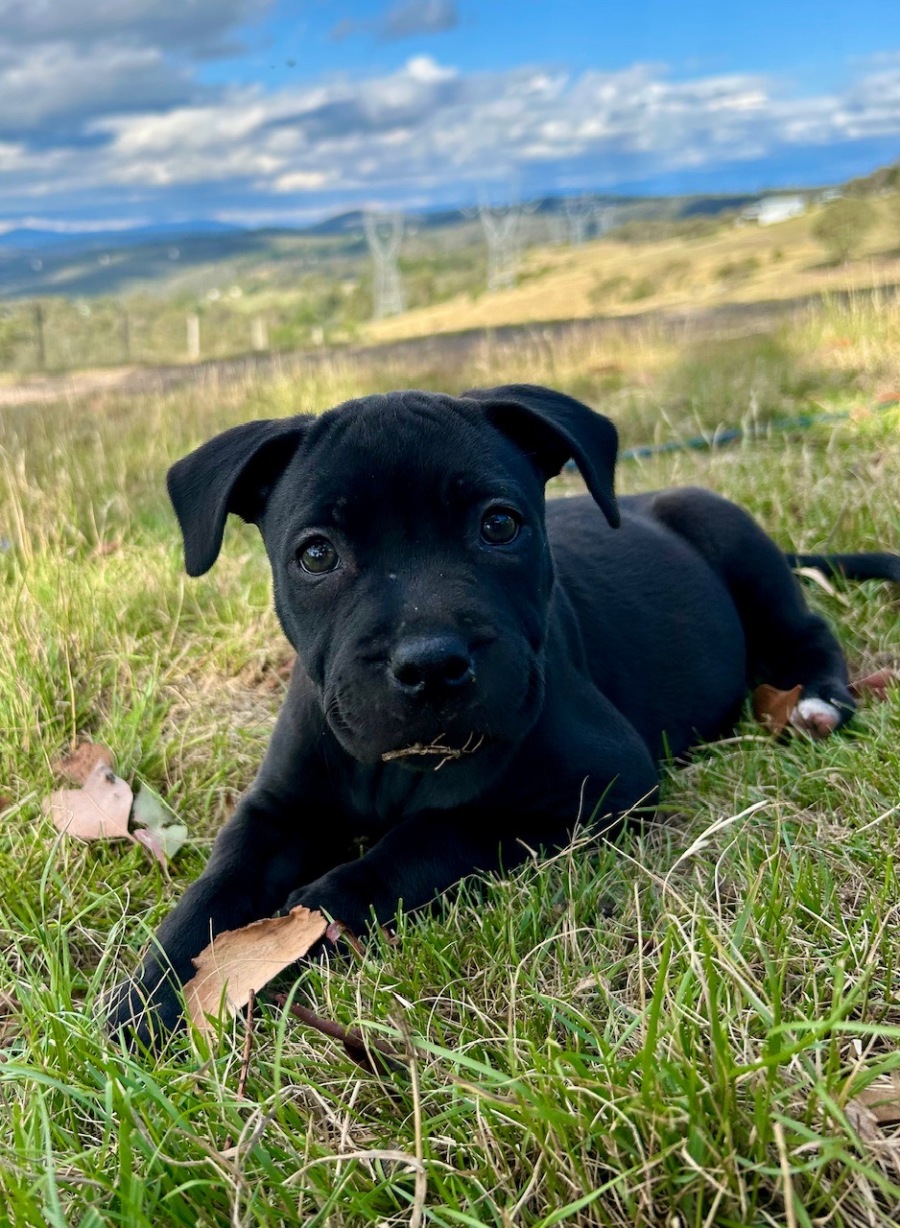 Bellangela and her brother and sister have been hand raised since they were two weeks old. She is a big, chunky girl but definitely the shyest out of the bunch. She can hold her own with her siblings but tends to sit back and watch in new situations. She is playful and sweet and just adorable. She loves people and has grown up with cats, dogs, horses, goats etc. She would definitely benefit from an adult, desexed male dog in new home to guide her. She would be ok with children but older children would be best because she is a typical mouthy, jumpy puppy. She spends most of the day outside playing and sleeps happily in a crate at night. She would be ok with an owner who works as long as she had a doggy companion. She would benefit from puppy school to help her grow into a well-adjusted dog.