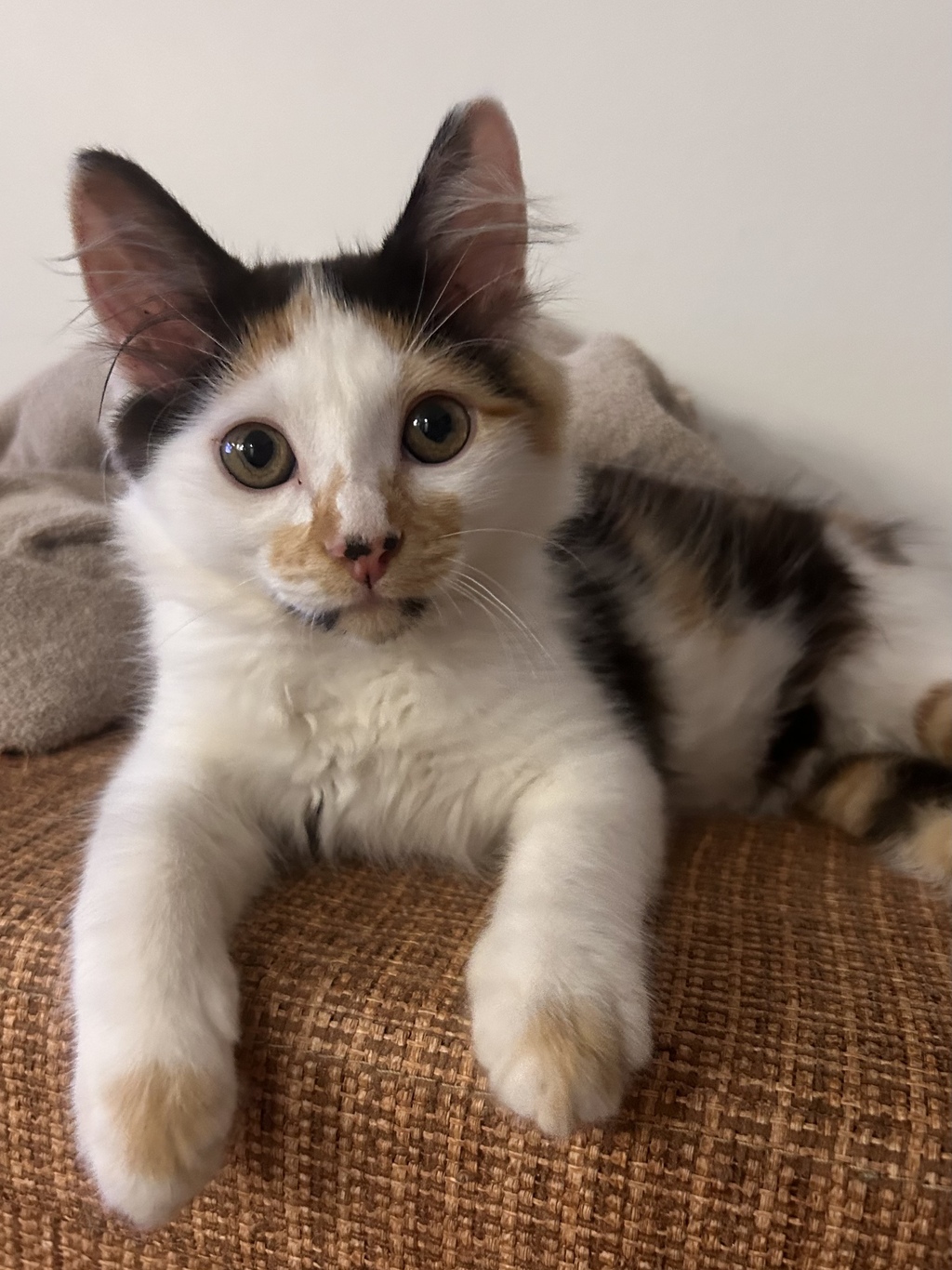 I'm just a kitten, but I've got a big personality! I love to play and explore, but I'm also a cuddle bug when it's time to relax. I love to cuddle up real close and give you lots of kisses! I'm loyal to my friends, always ready to share a purr or a comforting nudge. But don't be fooled, I can be a bit of a princess. I like to be the boss when it comes to other kittens, but it's all in good fun. I'm just trying to keep everyone in line! At the end of the day, I'm just looking for a forever home where I can share all my love and playfulness. I have been in foster with other kittens and adult cats who I've grown very fond of, and I don't even mind the big dogs that are there too! So why should you adopt me? Well, if you're looking for a loyal, cuddly, and playful companion, I'm your girl. I promise to bring joy and laughter into your life every day!