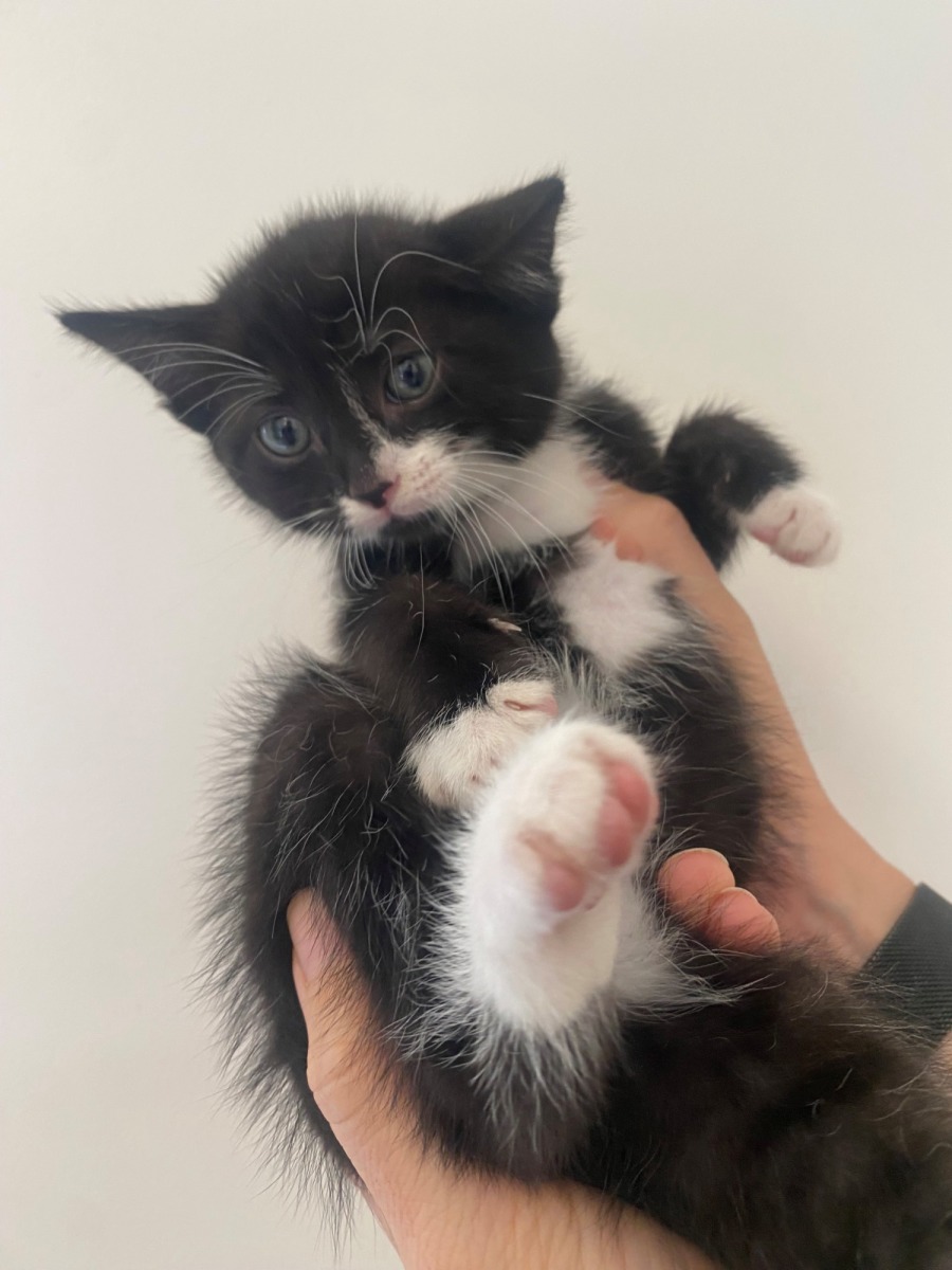 This sweet, playful, and cuddly black-and-white kitten is ready to find a forever home. With his striking coat and big, curious eyes, he is sure to win your heart.
