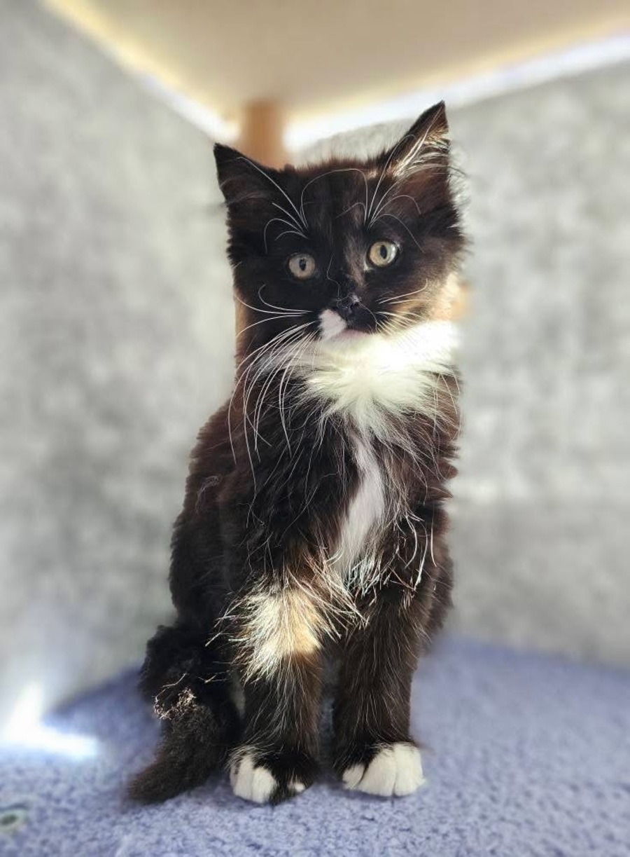 Dusty is a stunning fluffy girl with the most gorgeous face and whiskers that have a mind of their own! 🐱 Her long, luxurious fur will make you want to cuddle her all day long. Dusty is a bit shy when meeting new people, but with some gentle patience and love, she will quickly warm up and reveal her sweet and affectionate nature. 💖