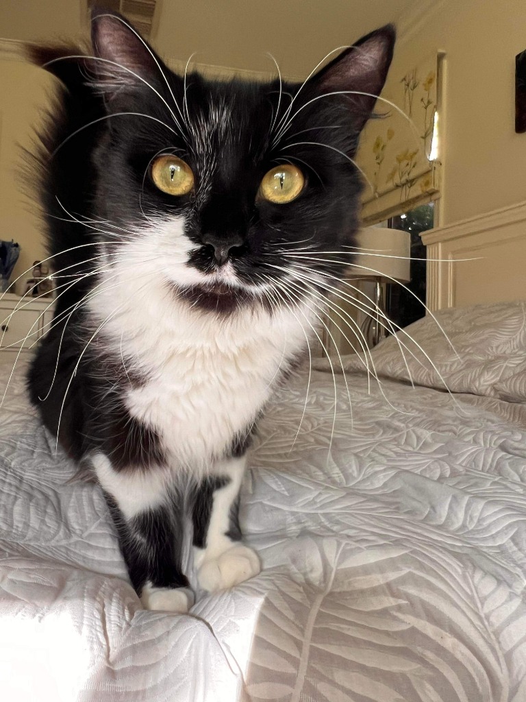 She has a playful side, too—hair ties are her favorite toy, and she’s known to perch in high places (like the top of the shower!). Her absolute favorite thing? Being outside. Fresh air, warm sun, and a little grass to nibble make her day. A secure cat run would be a dream come true.