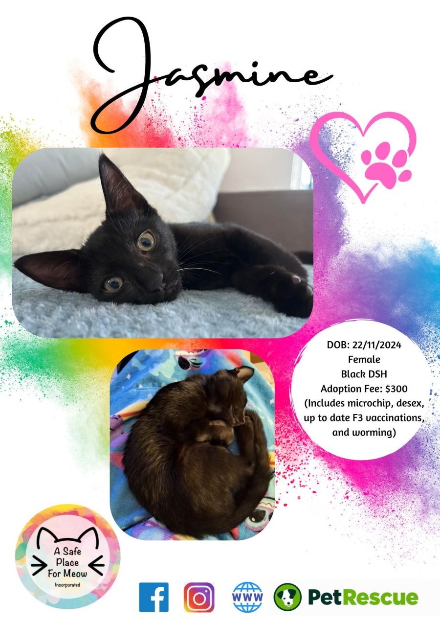 With her sleek black coat shimmering like the night sky 🌙✨, Jasmine is as beautiful as she is sweet. Whether she’s keeping you company, helping around the house, or dozing in your lap, she’ll fill your home with magic and love.