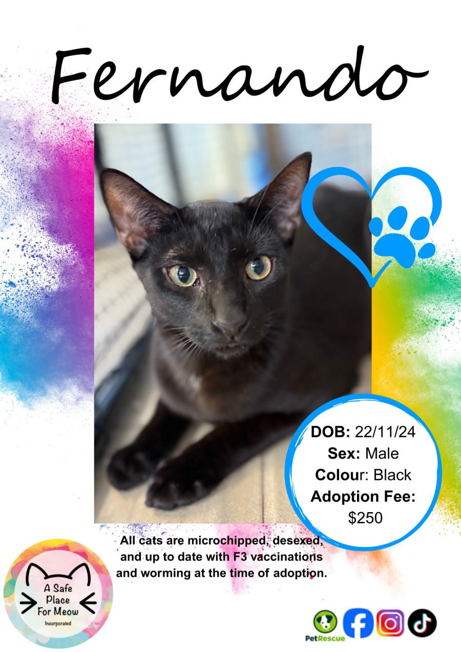 Fernando is the perfect blend of affectionate and playful. Full of energy, he loves to spend playtime running around, chasing toys, or exploring every nook and cranny of his home. But when the play is done, he wonderfully transitions into a loving companion, eager for your affection and always ready for lots of cuddles.