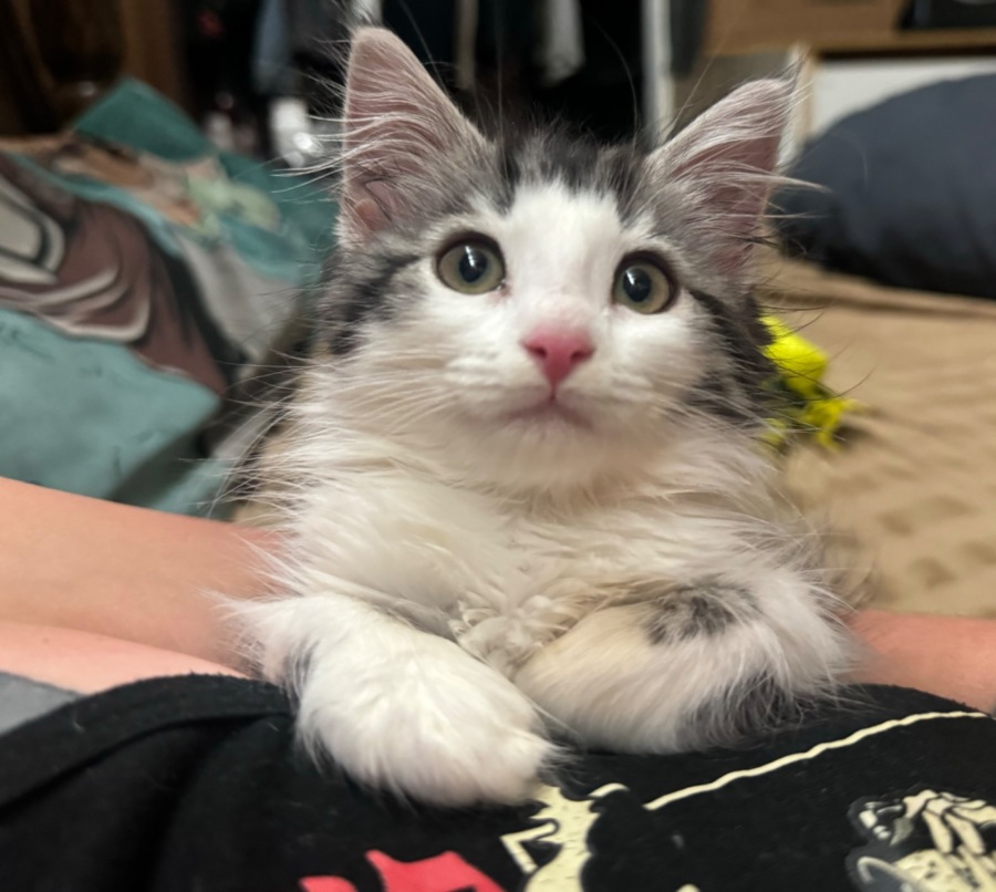 Fern is not just a foodie; he's a charming little cuddler, too. Whether it's feeding time or cuddling, Fern is there to steal your heart. In fact, this affectionate kitten will happily snuggle in your arms for hours if you let him, cementing his place as a wonderful, devoted companion.