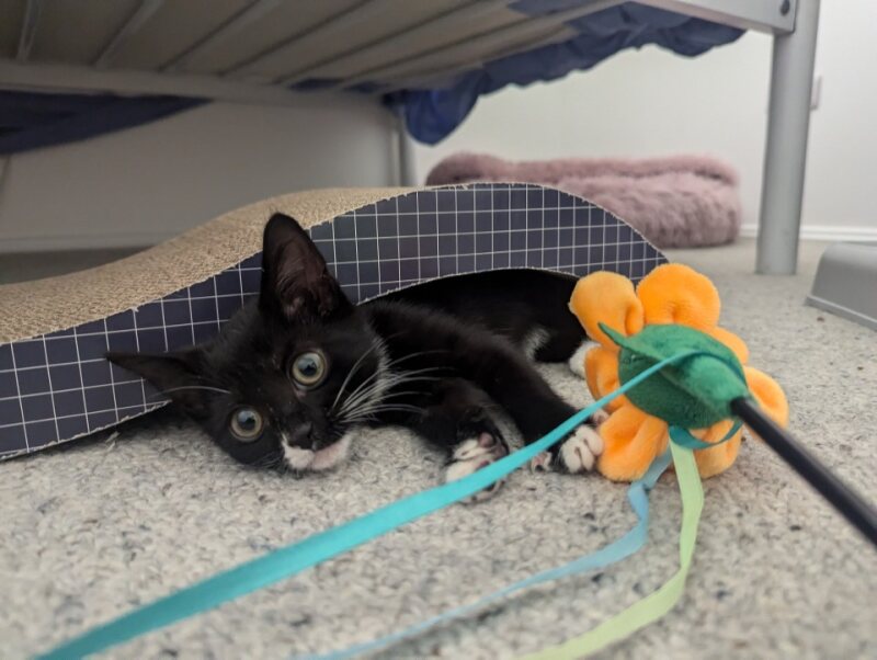 Hello there, I'm Stockings! I'm a sweet little lady, My hobbies include chasing after balls, exploring new places, and giving the best cuddles. I'm quite the little adventurer, always curious and ready to play. My energy levels are high, which means lots of playtime and fun. I love interactive toys and anything that keeps me moving. As for my personality, I'm a bundle of joy and warmth, always ready to share a purr or a nuzzle. I'm also good with children, so I think I'd fit well into any family. I'm a young kitty with a lot of love to give, and I hope to find a family that will share that love with me.