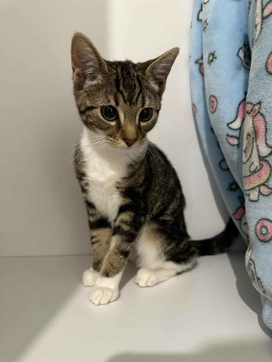 Meet Georgie, an incredibly endearing feline companion who may be a little shy at first but will surely blossom into a playful and affectionate friend.