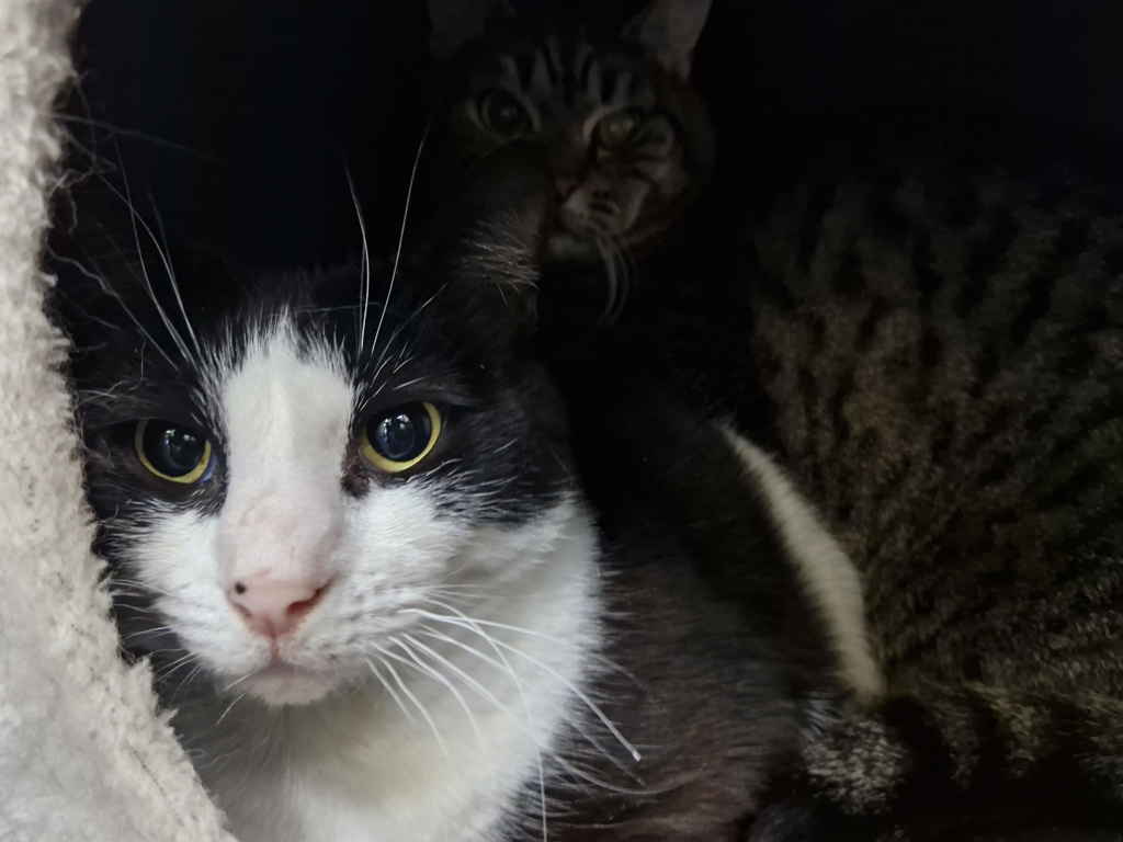 Moo Moo is the more curious of the two, often found peeking out from a cozy hiding spot, and Johnny is her quieter, more cautious counterpart, who enjoys spending his time observing from a distance. While they may be shy initially, they're incredibly loving once they get to know you. A calm environment with lots of love and patience will soon have them sitting on your lap and headbutting your chin.