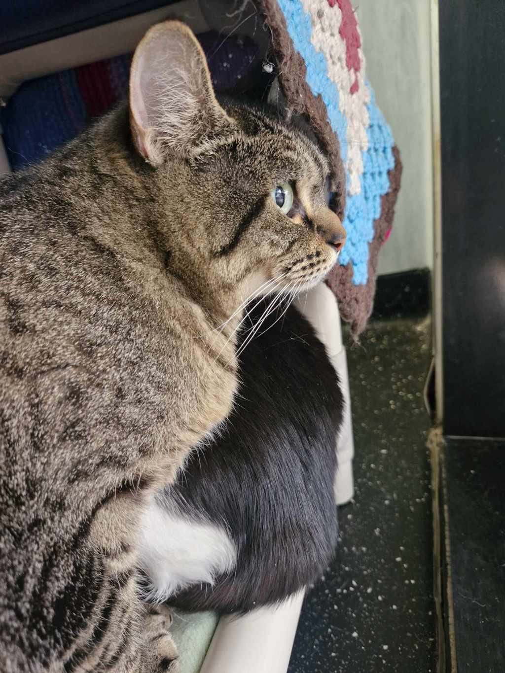 Moo Moo is the more curious of the two, often found peeking out from a cozy hiding spot, and Johnny is her quieter, more cautious counterpart, who enjoys spending his time observing from a distance. While they may be shy initially, they're incredibly loving once they get to know you. A calm environment with lots of love and patience will soon have them sitting on your lap and headbutting your chin.
