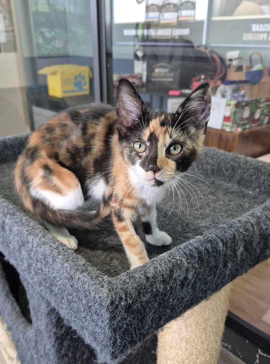 Hey there, I'm Effie. I'm a friendly and affectionate kitten who would suit most homes! My playful paws are always ready to pounce on anything that moves. I love playing with wand toys and mysterious shadows on the wall! When I'm finished playing, I love nothing more than finding a warm lap to curl up in. I have perfected the art of the irresistible purr. It's like my secret weapon for getting all the cuddles and chin scratches I could ever want. Life's just one big, exciting string of moments, and I'm here to make every second count - whether I'm chasing my tail or sharing some purr-fectly quiet time with my favourite humans. So, if you're up for a bundle of furry fun and a lifetime of companionship, please consider adopting me!