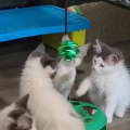 Rosie is talkative and will keep you engaged with her charming meows and chirps until she gets the affection she seeks. Once she has your attention, she transforms into a purr machine, a sign of her contentment and joy. Given her tender age, Rosie needs a loving home with another cat-friendly feline, whether it's a sibling like Mootilda or an existing family pet, to keep her company and join in her playful escapades.