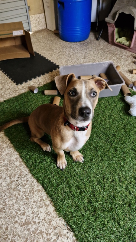 Joey is a sweet and curious puppy with a unique look and a gentle soul. Having come from a home with limited exposure to people, Joey is still learning about the big world around him. He’s shown that he feels more confident when he has the company of another dog, so he must go to a home with a friendly and well-adjusted canine companion to help him settle and grow. Though he’s shy at first, Joey has a lot of love to give once he feels safe. In care, he has shown fearful behaviors, like hiding, so a crate in his new home is highly recommended to provide him with a secure, quiet space where he can retreat whenever he needs.